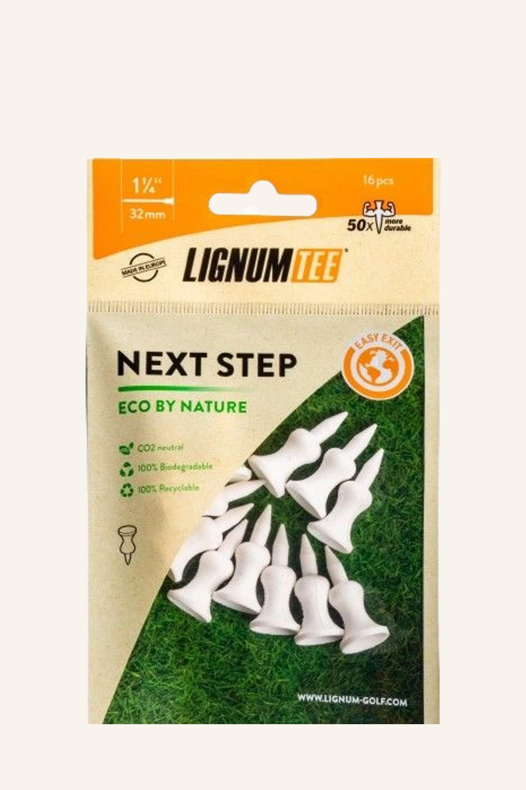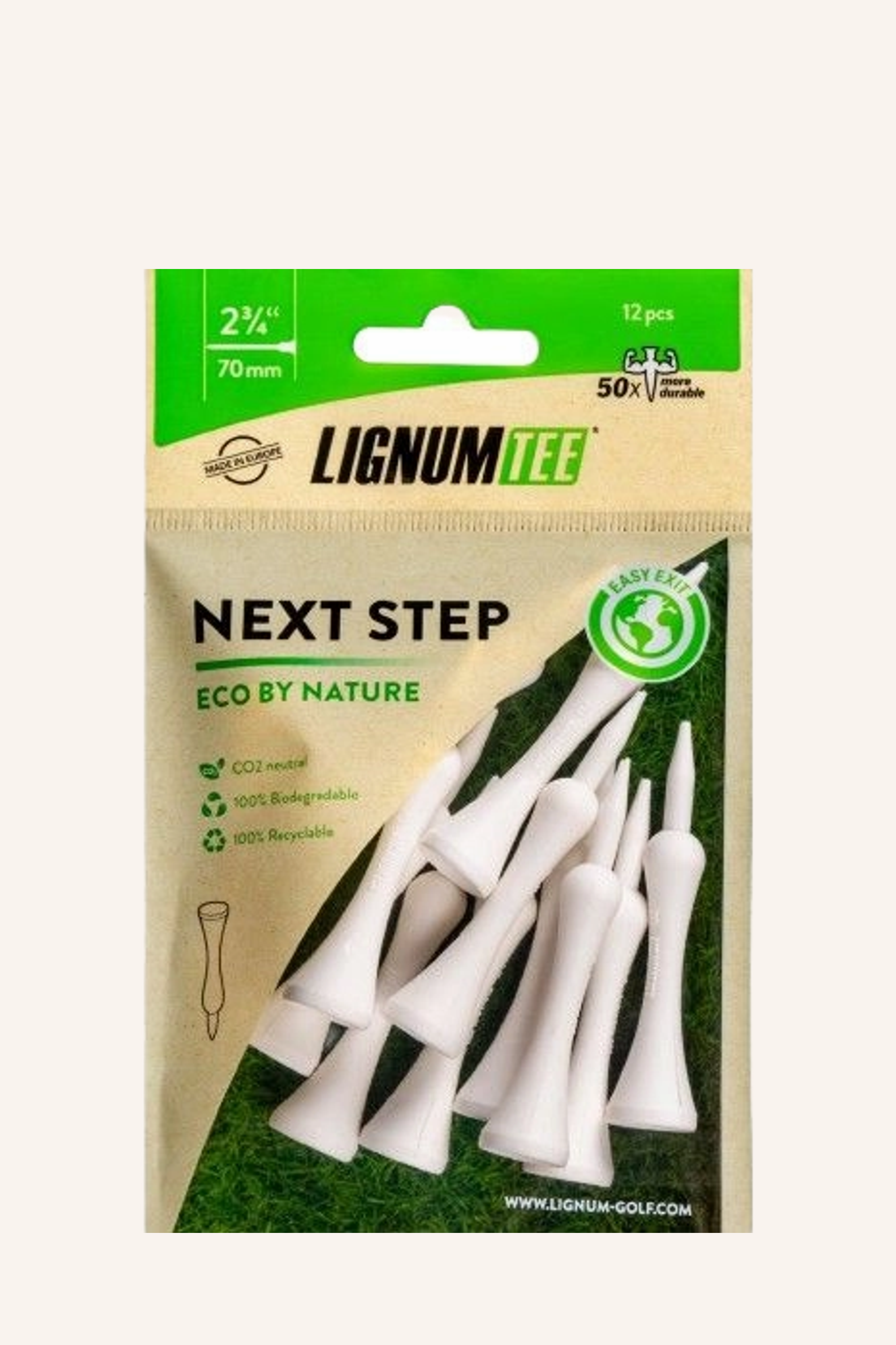 Das Next Step Tee von Lignum überzeugt durch seine durchdachte Materialwahl und Funktionalität. Es besteht aus einem hochmodernen Biopolymer, das zu 99% aus Mais gewonnen wird und somit eine biologisch abbaubare und CO2-neutrale Alternative zu herkömmlichen Tees darstellt. Die verschiedenen verfügbaren Längen ermöglichen eine Anpassung an individuelle Vorlieben und Schlägerwahl.